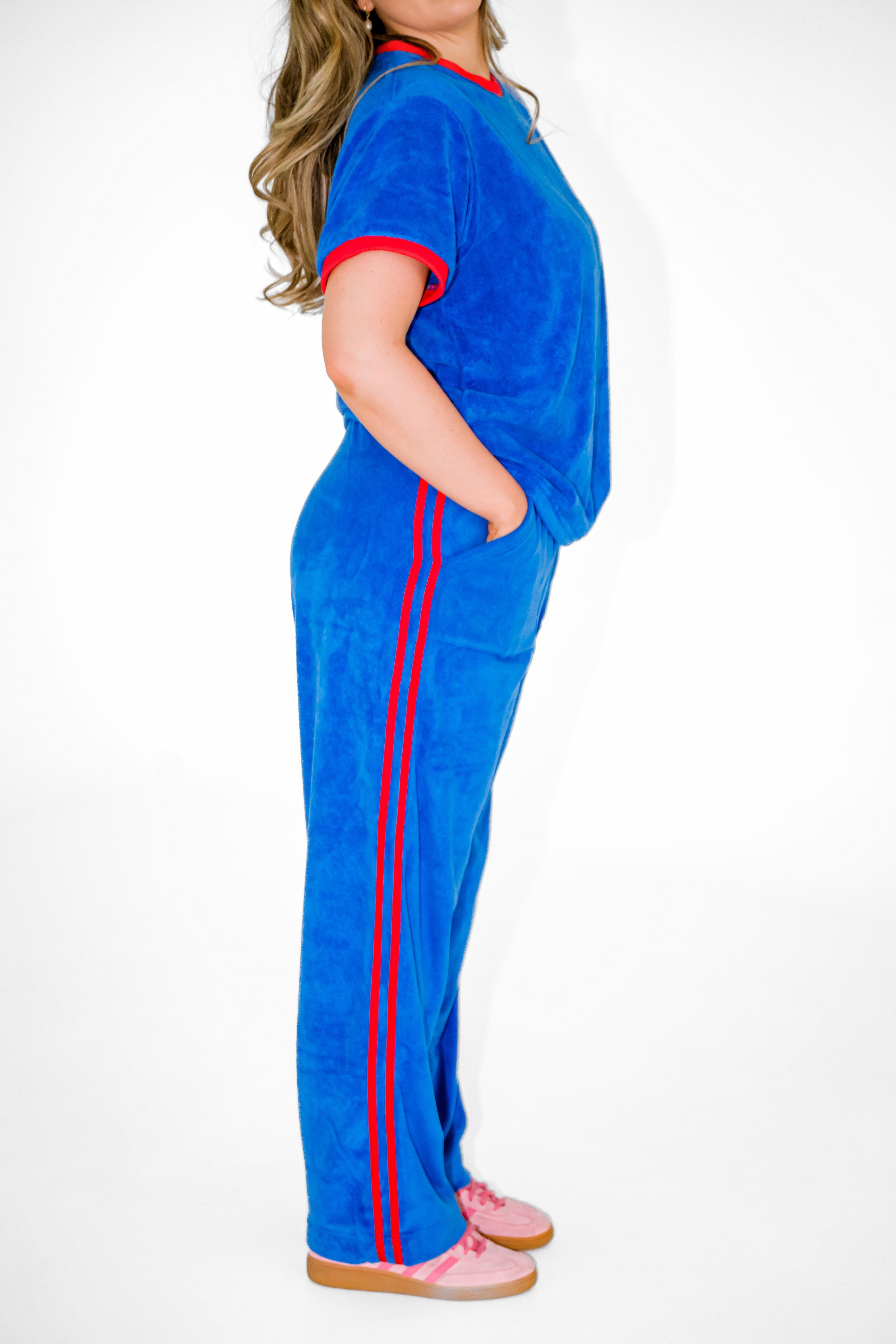 Our plush blue terry is finished with contrast red stripes, striking the perfect balance between relaxed and statement-making.