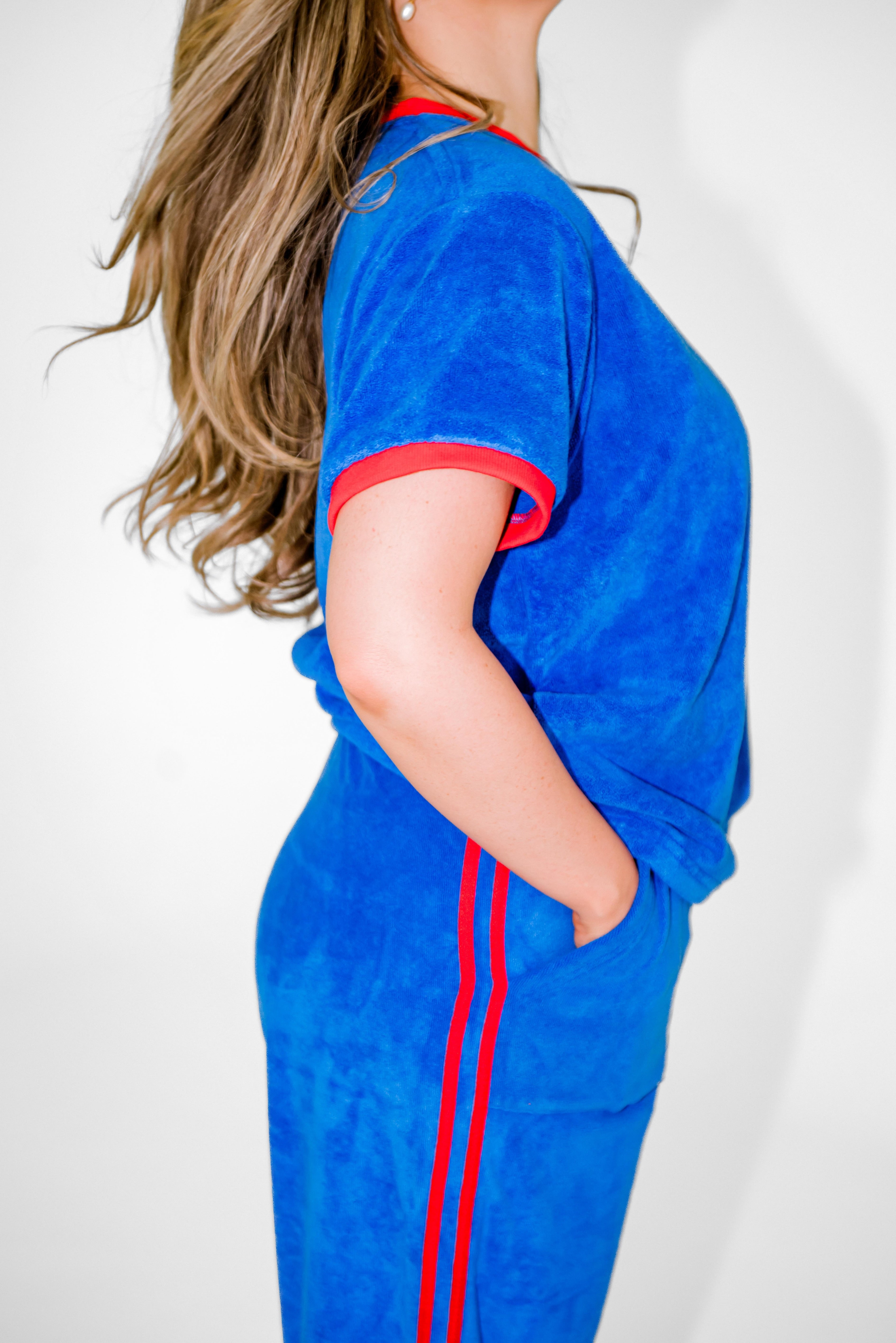 Pants and tee in soft, comfortable terry — the kind you throw on without thinking and somehow always feel good in.