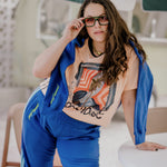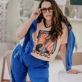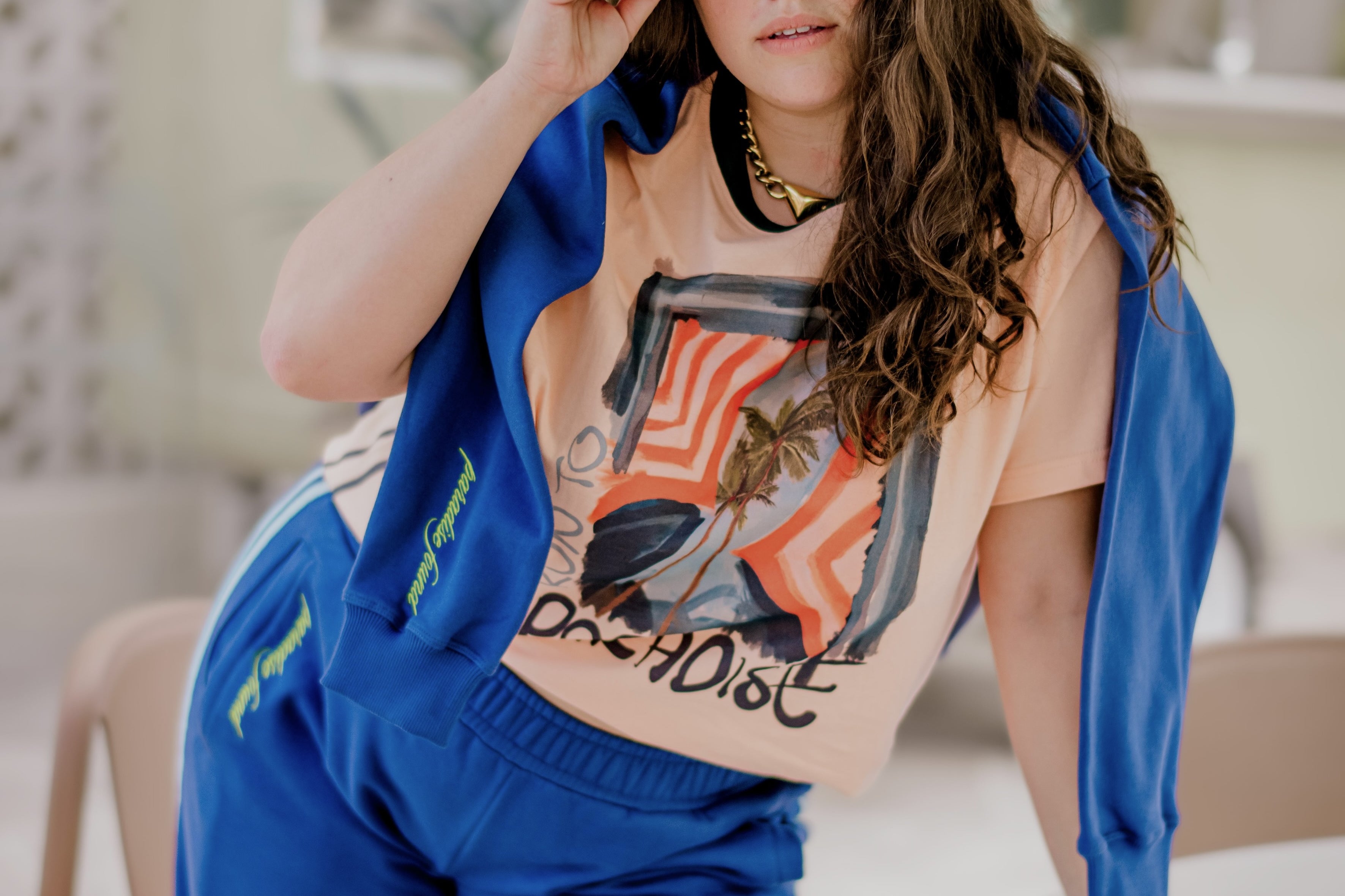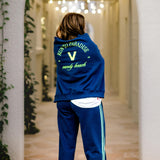 These trackies are the ultimate winter mood: baggy, plush, and unapologetically relaxed. In deep blue with soft baby blue stripes and a neon paradise found embroidery hit, they’re as bold as they are snuggly.